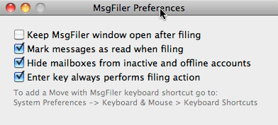 Now, there’s an option in the Preferences window to do away with the double keypress. Longtime users of MsgFiler will have to retrain their muscle memory, but try it out and see if this makes filing faster!