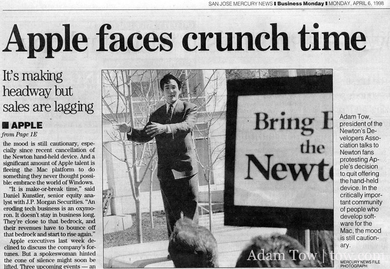 Of course, in February, 1998, Apple cancelled Newton. Shortly afterwards, I organized the Newton protest at Apple headquarters in April, 1998. While Steve didn’t personally come down, he did send milk and cookies for the protesters!