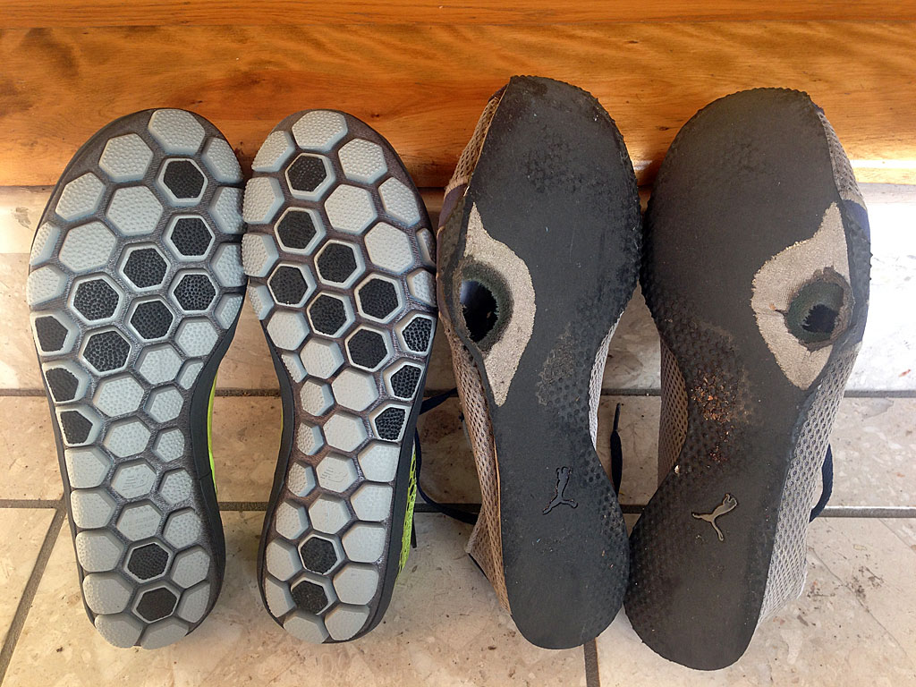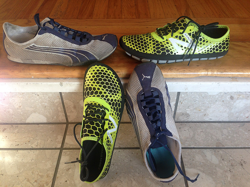 For the past several years, my running shoes of choice have been the Puma H Streets. These are a favorite of the POSE running crowd, although they were never meant to be used as running shoes. Today, they are harder to find in my size (women’s size 10, since I can’t seem to find the men’s version anymore). So, when I finally decided that the holes in the shoes were getting too big (check out the photo below), I started looking for a new pair and brand of running shoes.