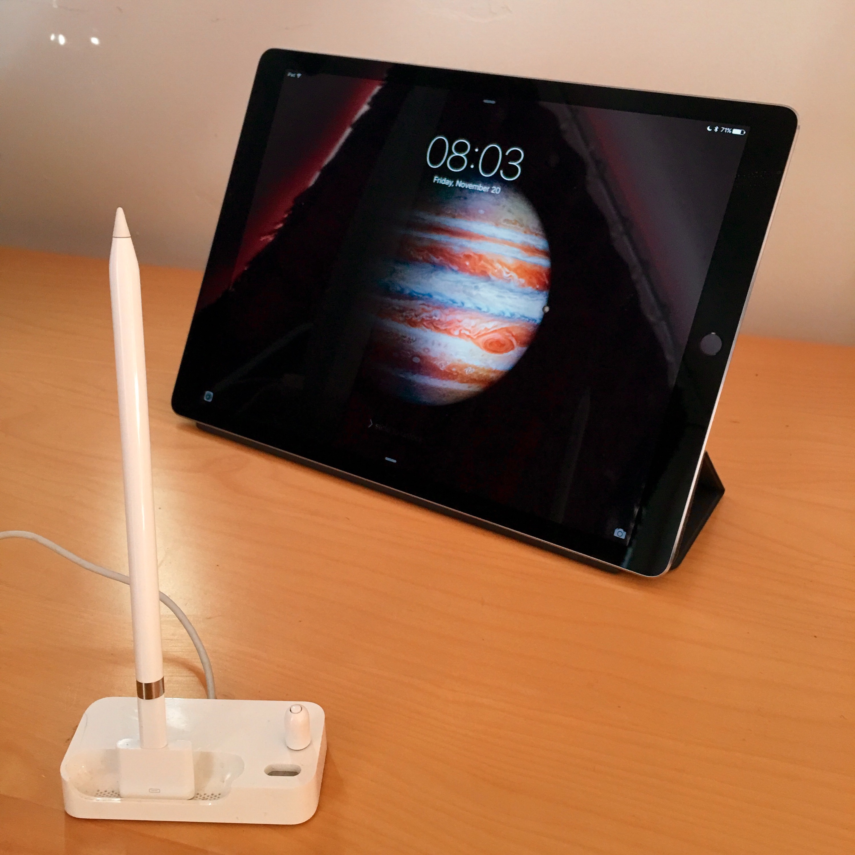 Lastly, I pulled the old Apple Bluetooth headset dock to function as a charging stand for the Apple Pencil. I connected a 30-pin to Lightning adapter to the Pencil’s female-to-female Lightning adapter to complete the system. The port for the headset is magnetized, so the Pencil’s cap won’t roll off the table.