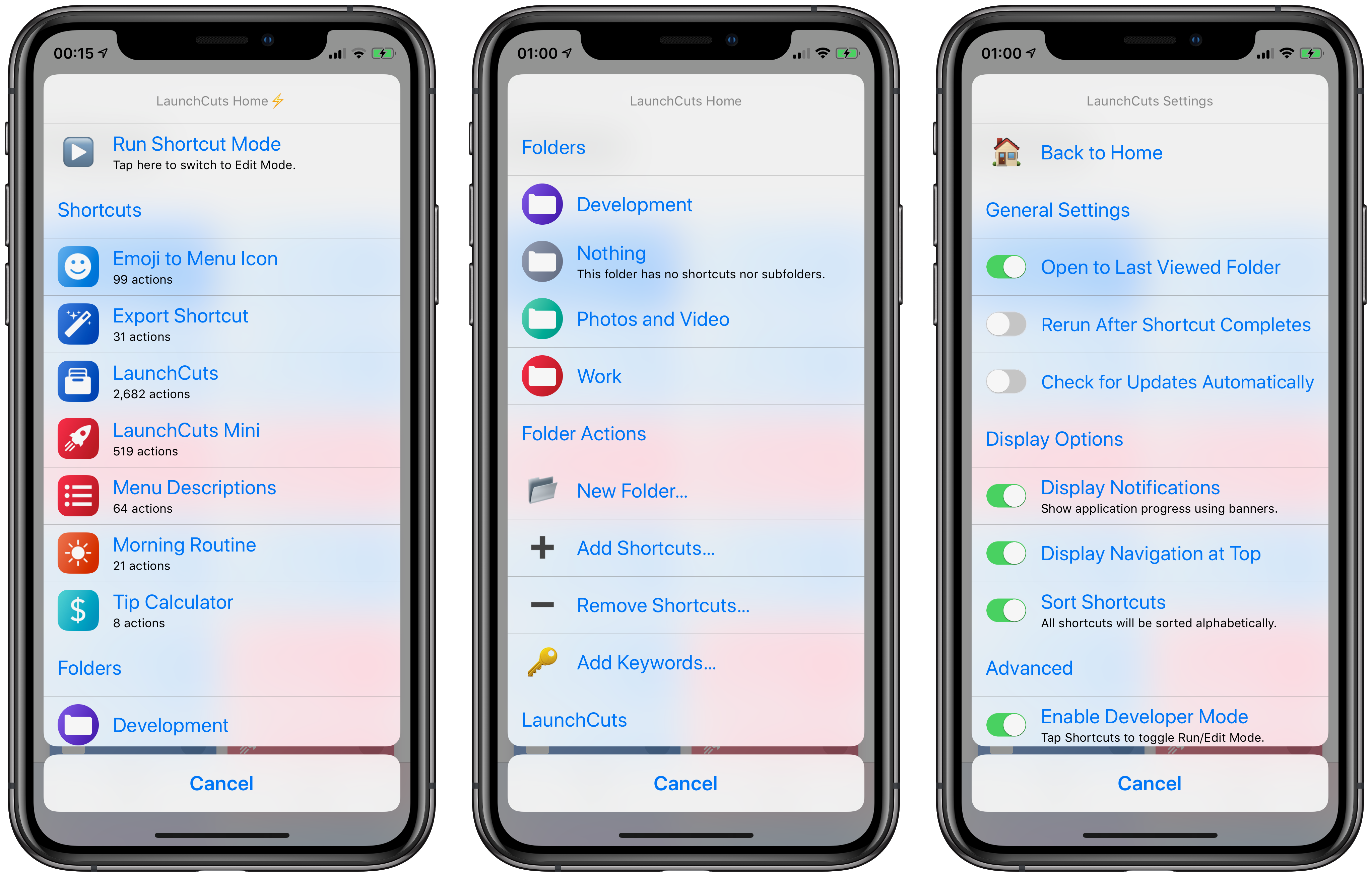 I’m happy to announce the release of LaunchCuts, a powerful, customizable, and elegant launcher for shortcuts on iOS. Built entirely as a shortcut with over 2,600 action steps, LaunchCuts lets you organize your shortcuts into folders manually or automatically generate lists of them using keywords.