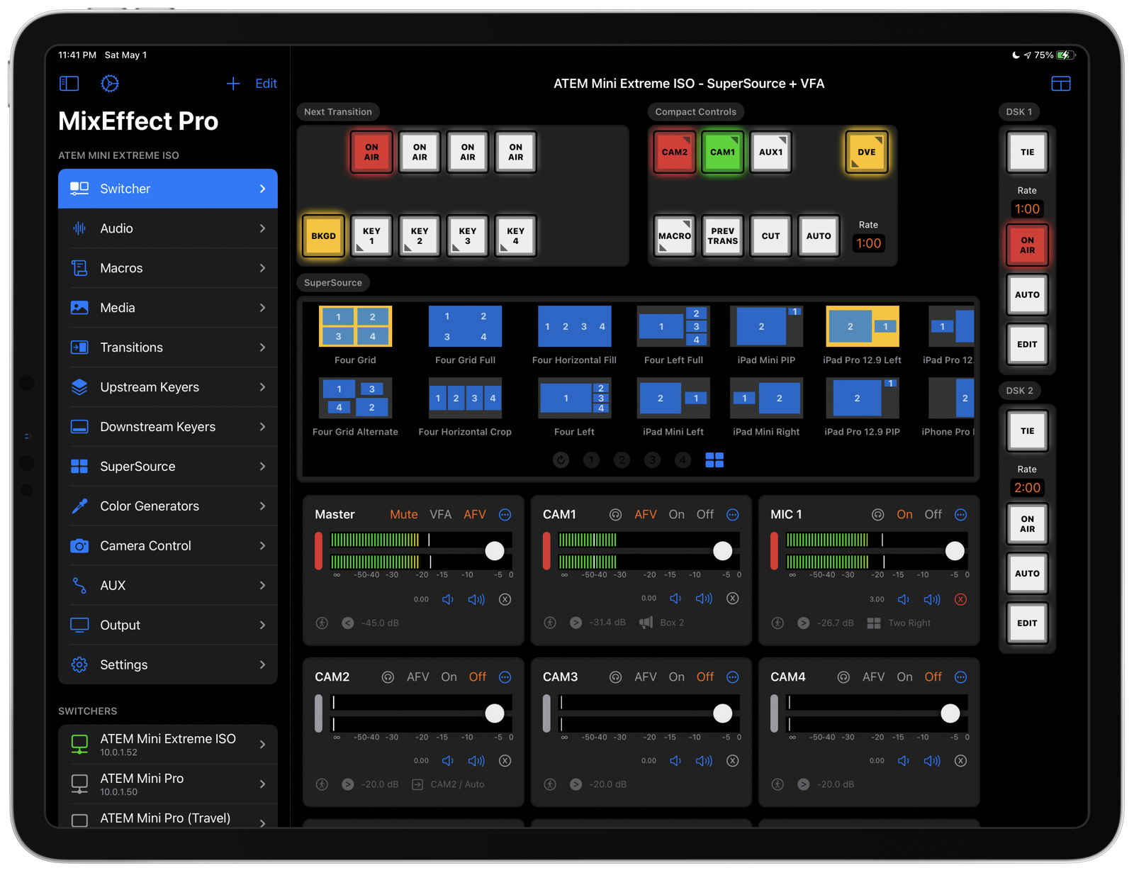 - Editing: Quickly adjust your transition, upstream key, downstream key, and SuperSource settings.