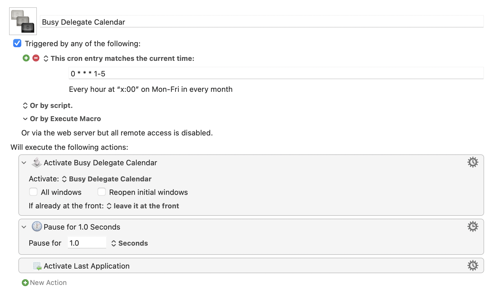 In both cases, the macro opens the last active application. I do this because I don’t want to lose my application focus when the script runs at the top of every hour.