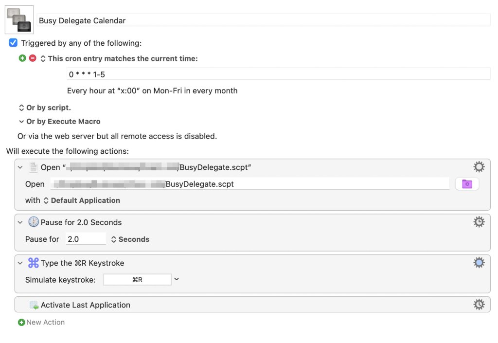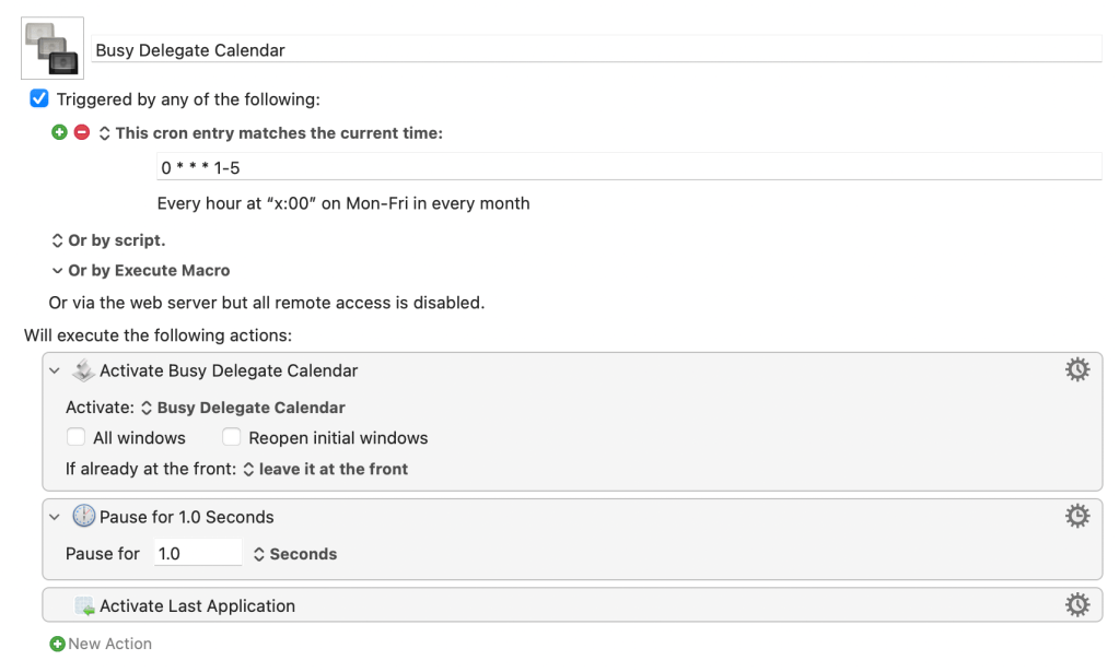Next, let’s add a cron Job to run the application on an interval that you choose. I ended up using Keyboard Maestro to create the job, since I’m lazy and didn’t want to muck with my crontab. This KM macro runs the application once every hour on weekdays using the schedule: 0 * * * 1-5.