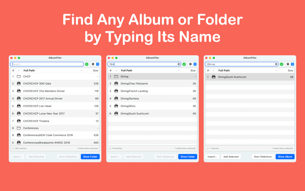 If so, AlbumFiler is for you. Its keyboard-based search feature, based on my popular MsgFiler utility for macOS Mail, makes it easy and fast to find the album or folder you want. Type just a part of the name and all the results appear instantly. Keep typing to filter down the results or press a shortcut to access the one you want.