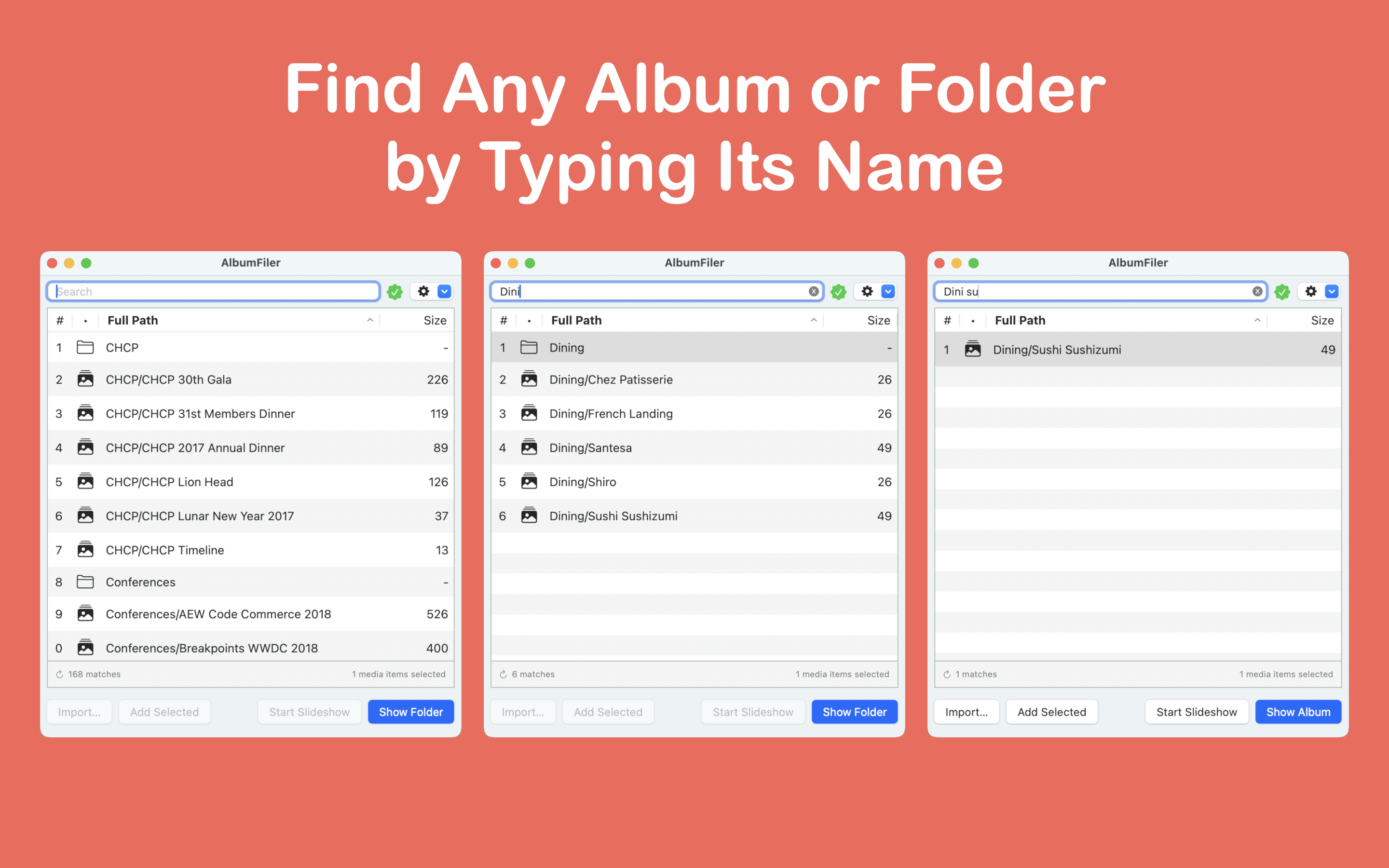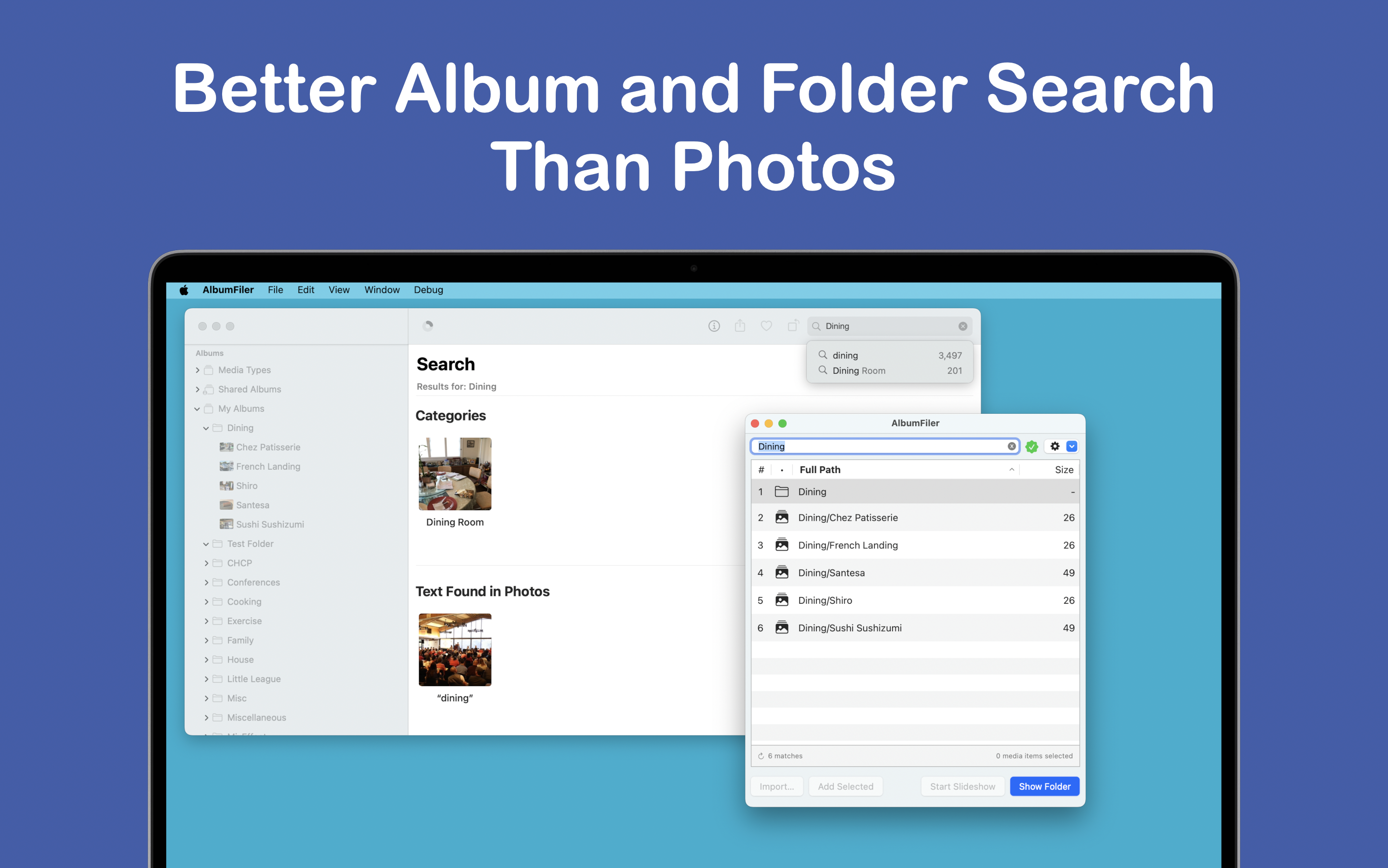 If so, AlbumFiler is for you. Its keyboard-based search feature, based on my popular MsgFiler utility for macOS Mail, makes it easy and fast to find the album or folder you want. Type just a part of the name and all the results appear instantly. Keep typing to filter down the results or press a shortcut to access the one you want.