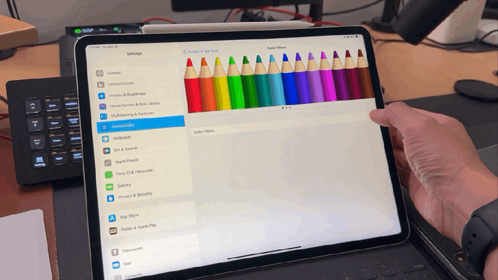 The 2018 iPad Pro clearly has the worst screen out of the three with significant yellowing. The original 12.9″ iPad Pro is much cooler and appears to be more color accurate. I have to turn on Color Filters in Accessibility and set the Intensity and Hue to the following values to correct the colors on the 2018 iPad Pro.