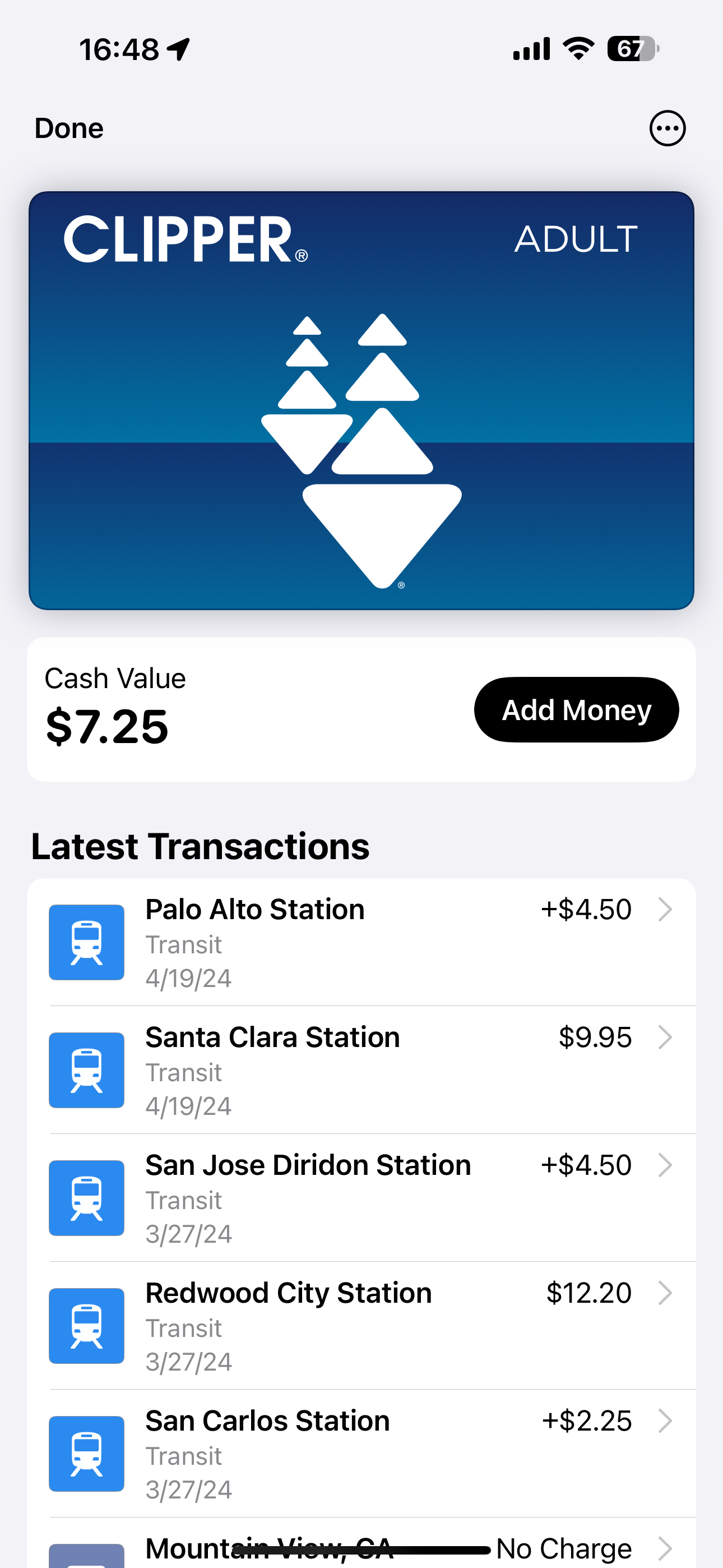 I tend to take Caltrain whenever I need to go up to the City. For that, I use a Clipper card. I can easily add money to it directly from the Wallet app on my iPhone. One downside, however, is that you cannot have the same Clipper card on both your iPhone and Apple Watch at the same time. You can have two different Clipper cards, but then you have to manage accounts and remember which one you used when tapping off at the station.
