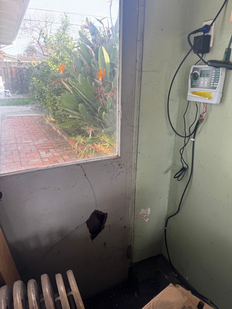 The original garage had a door to the backyard pathway which we never used. There was no door knob, just a latch which we padlocked. There was a giant hole through part of the door, and it was constantly dusty and gross in that corner.