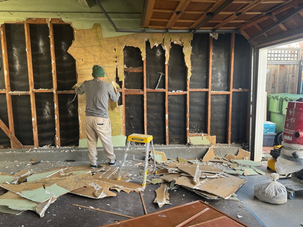Since I wanted to be able to work in the garage, adding insulation to the side wall and ceiling was important to me. We removed the existing drywall on the non-house facing wall. It originally had an elevated shelf and a giant wallpaper depicting ham radio stations a sectional aeronautical chart of the continental United States. Here’s a photo of the wall before, during demolition, and after the drywall was installed and painted.