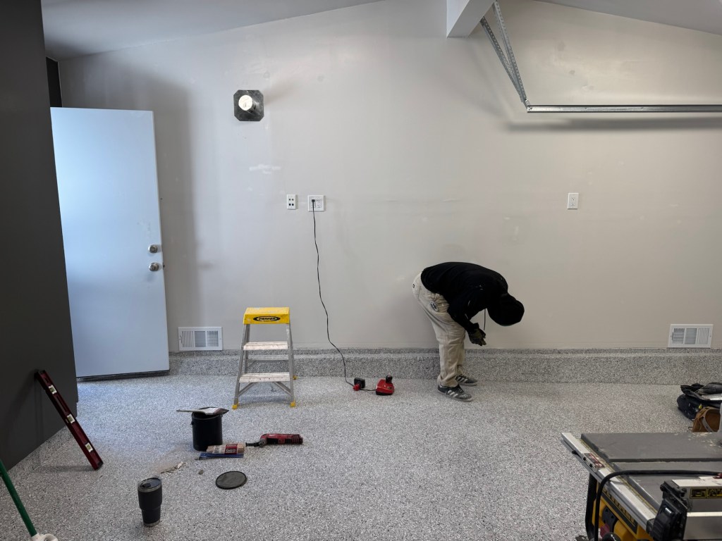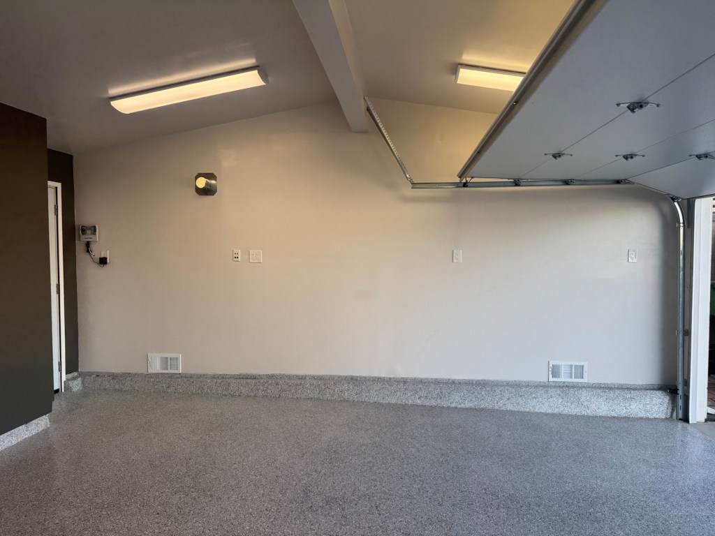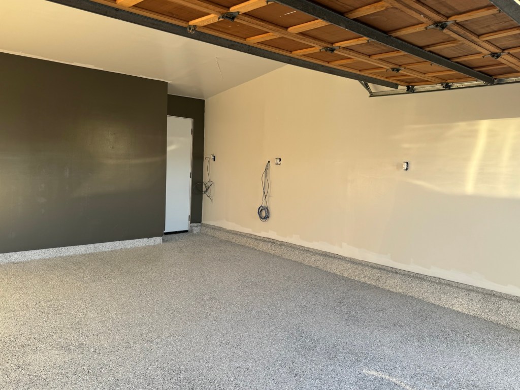 I wanted all of that gone and replaced by a nice and durable epoxy floor. We chose gray, dark gray, white, and black flecks, along with a polyaspartic top coat so the floor doesn’t turn yellow over time.