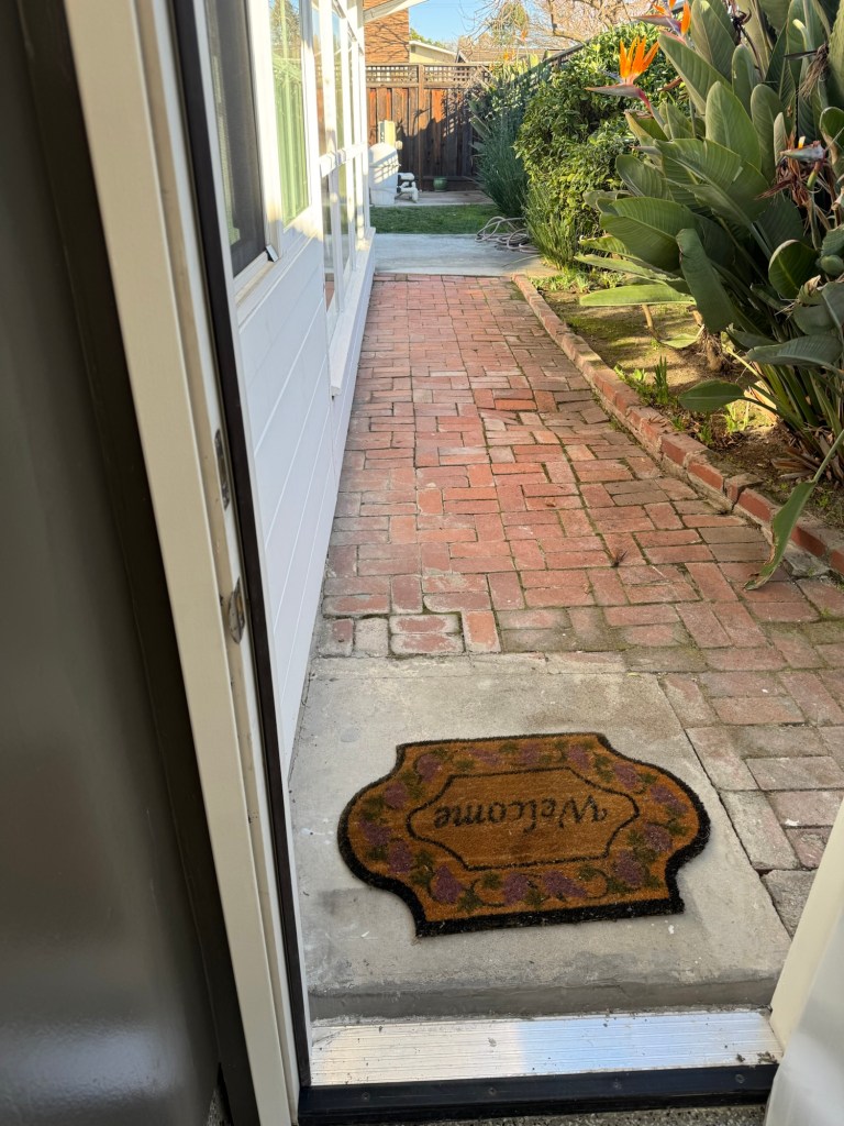Our previous garage door was wooden, heavy, and loud. It had started to bow on either side, and this led to leaves, bugs, lizards, and the occasional possum to venture into the garage. The new garage door is made out of metal and has a rubber weather strip below and on the sides to prevent things from getting in.