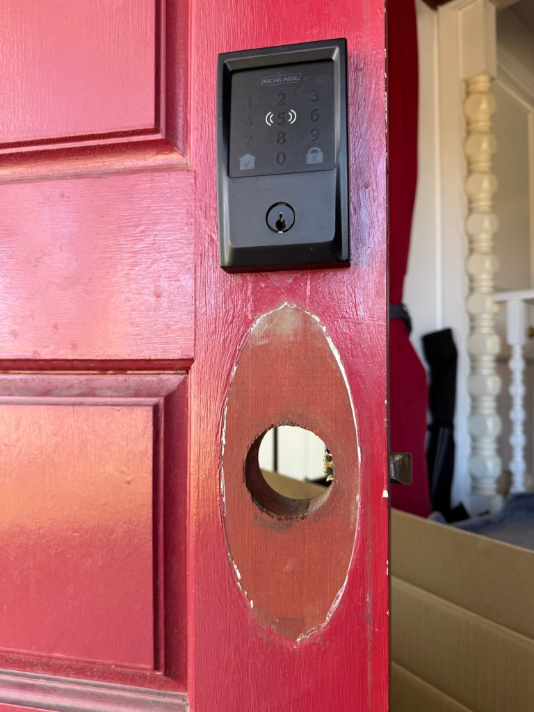 Before installing the handleset, I waited a full 24 hours for the paint to dry. I had Rae buy me a 3/8” drill bit since all of the ones I had were much smaller. The big bit was necessary because the Schlage handleset has a bolt which is installed 9 inches below the cylinder.