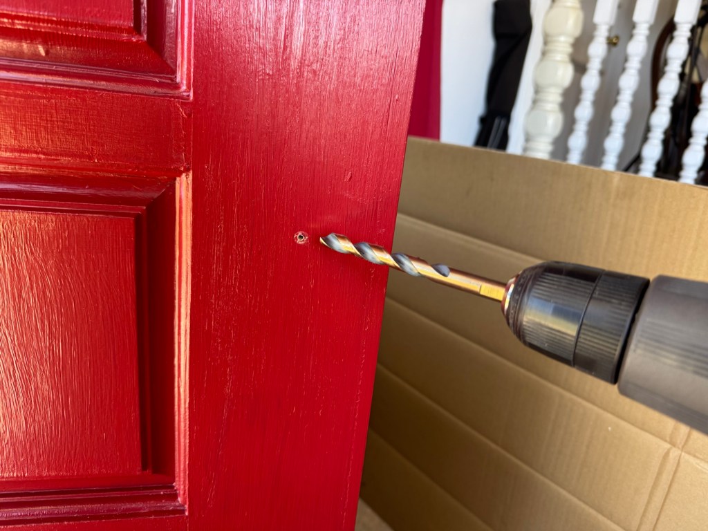 Watching some videos on YouTube, I performed the following steps to get that hole drilled into the door: