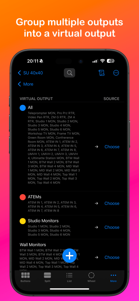 RouteEffect provides five distinct ways to visualize and manage your Videohub routing: Buttons, Split, List, Wheel, and Crosspoint. Simply tap an output and assign it to any source. With real-time switching and instant visual feedback, RouteEffect adapts to how you want to work in the moment.