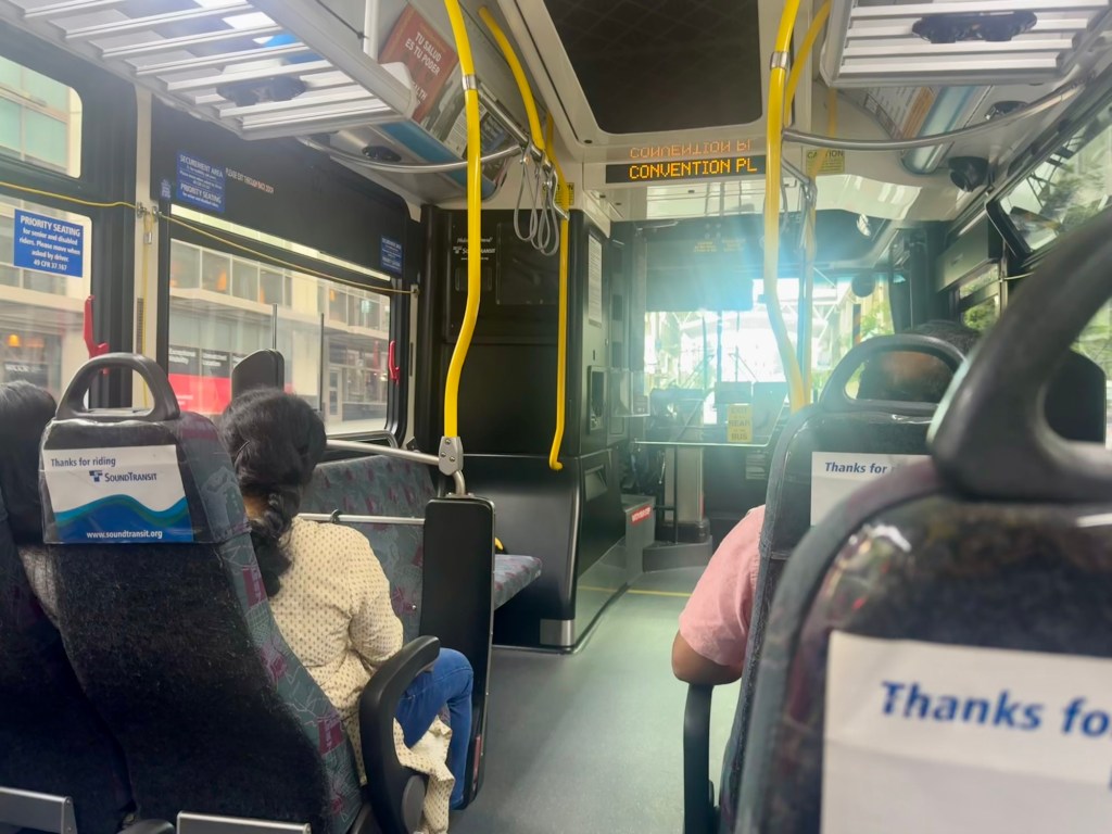 When he’s not “borrowing” cars from bad guys he beats up, Jack Reacher travels primarily by bus and trains. And like the fictional modern day knight errant, we took the bus from Bellevue to downtown Seattle each day. This meant taking a local King County bus before transferring to either the 550 or 554 ST Express that went over the bridge. Adults pay $2.75 for the KC bus and $3.00 for the ST Express. Youth under 18 are able to travel on buses for free (they have to pay a discounted price in the San Francisco Bay Area). So, that came out to $23 roundtrip each day for the three of us, far cheaper than paying $60 for a one-way Uber ride, or $120 for roundtrip.