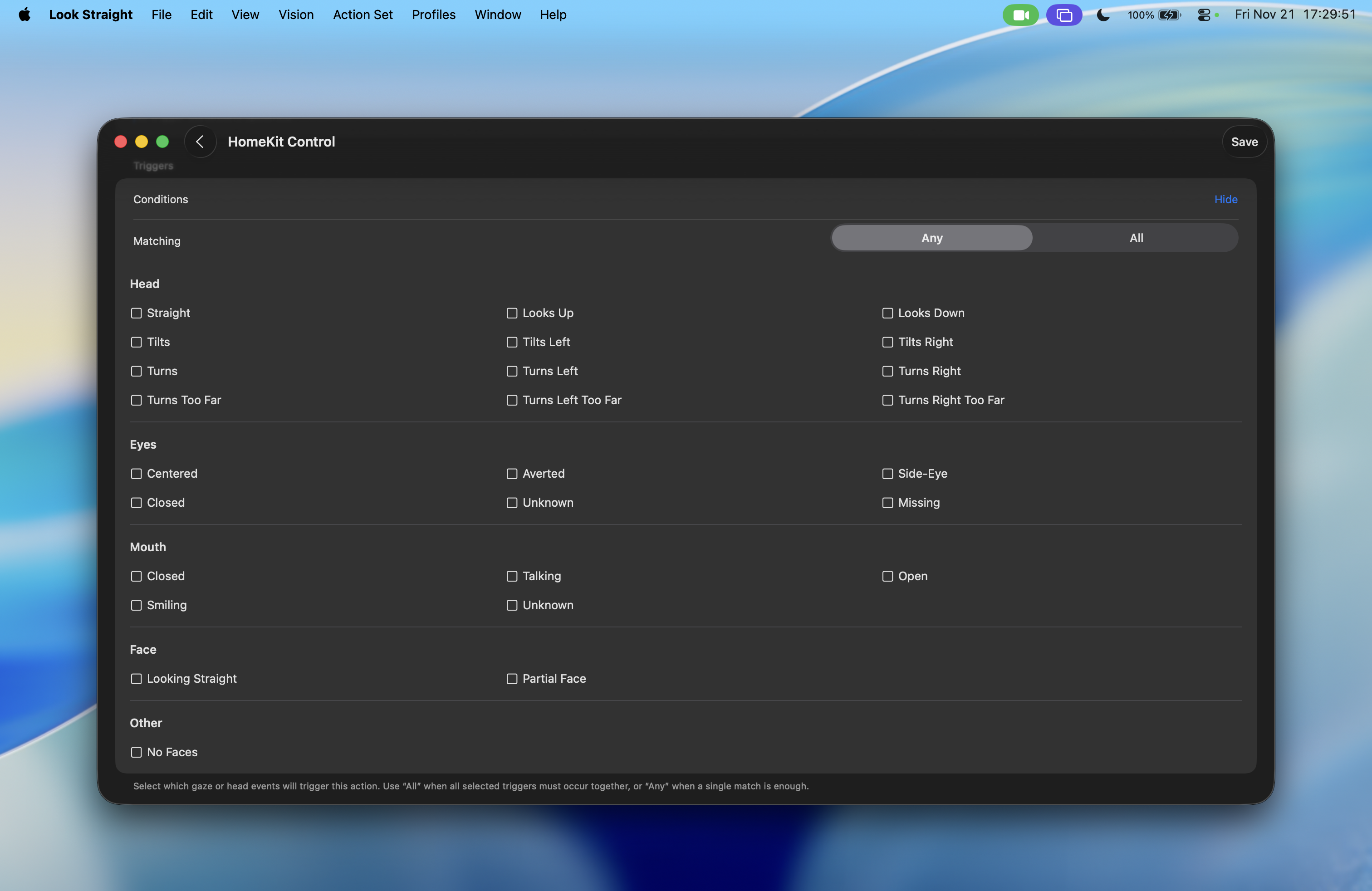 Look Straight recognizes head turns, tilts, and nods, eye movements, and mouth expressions. You can then trigger actions like sounds, text-to-speech, shortcuts, OSC messages, web requests, photos, and HomeKit control, and get feedback instantly when detecting these gestures.