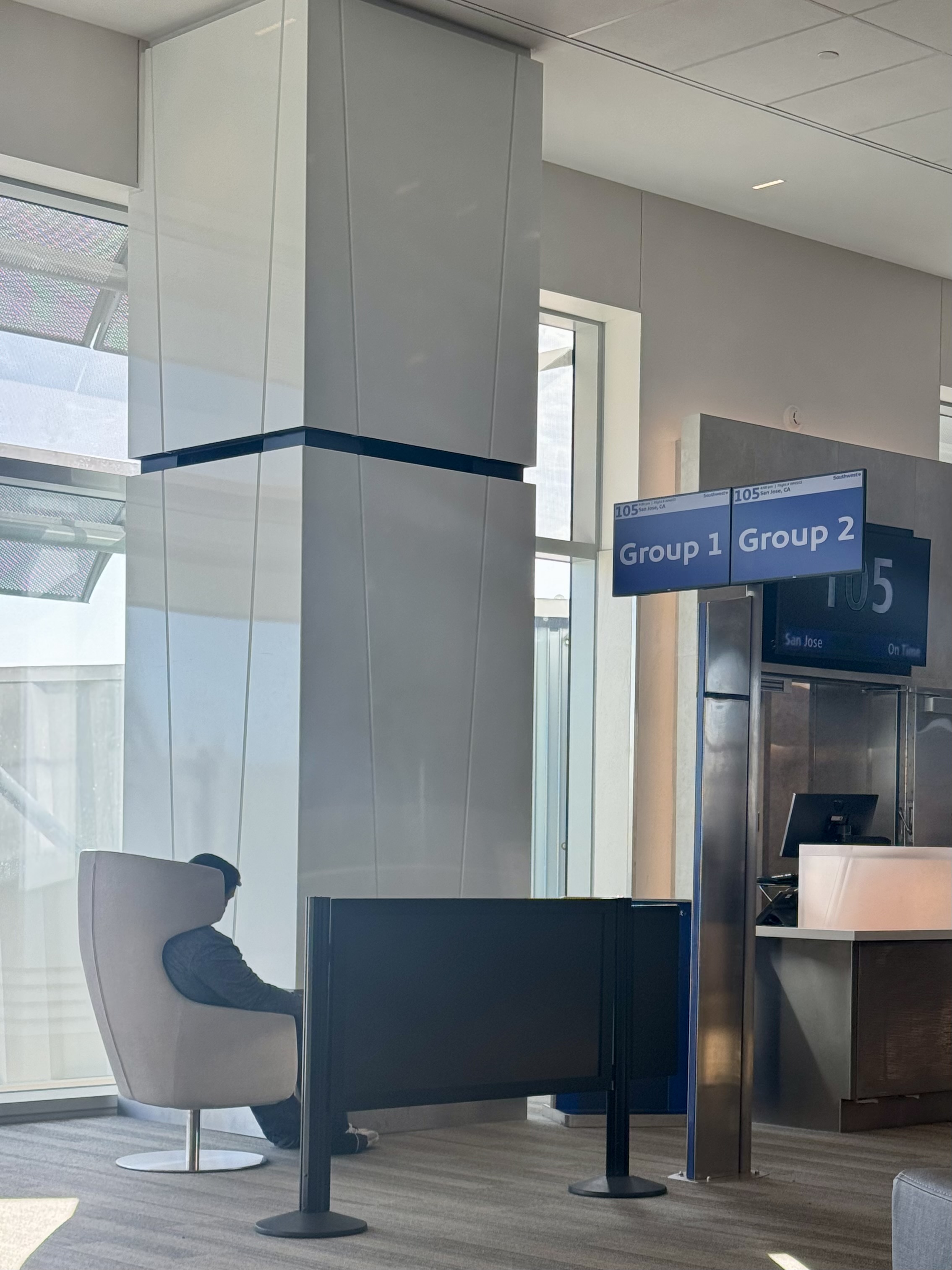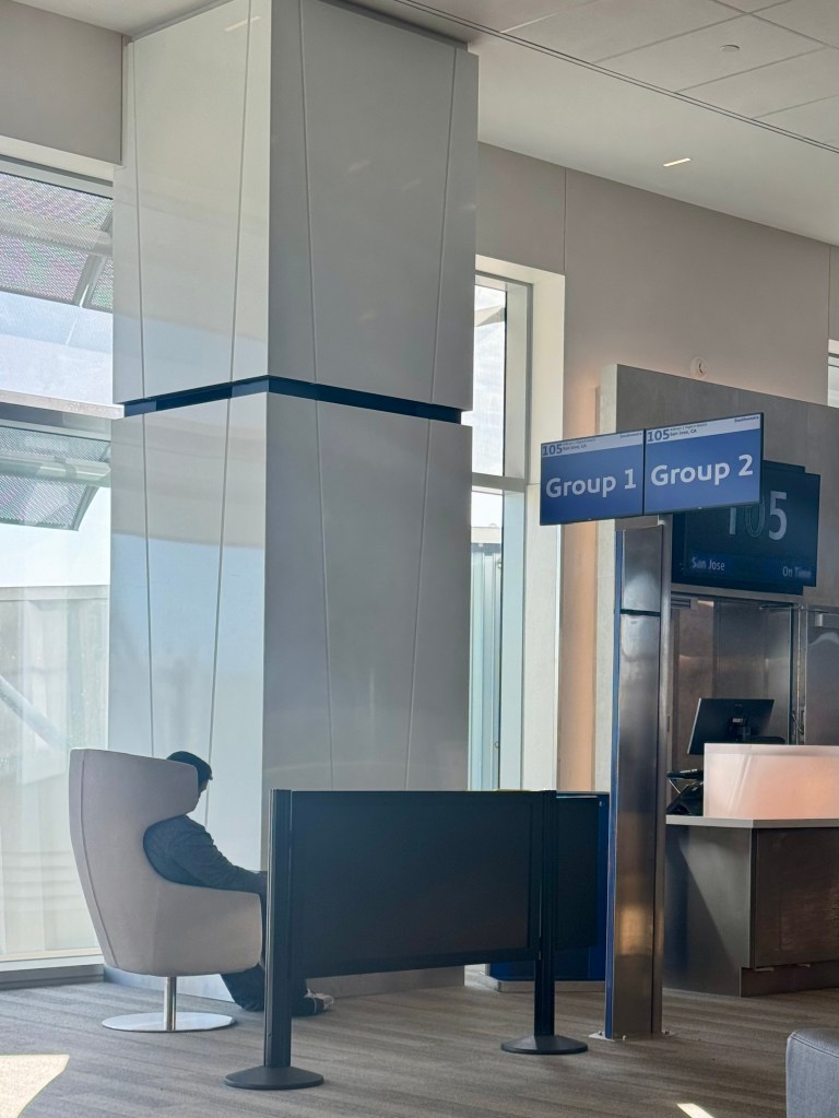 After the last flight on the 27th, Southwest employees across the country updated the signage and ripped out the boarding position stanchions. In their place are now two monitors that show which numbered group is boarding and which group should line up next. I bought the cheapest seat available, so I was in the eighth and final boarding group, and my seat was in the back of the plane.