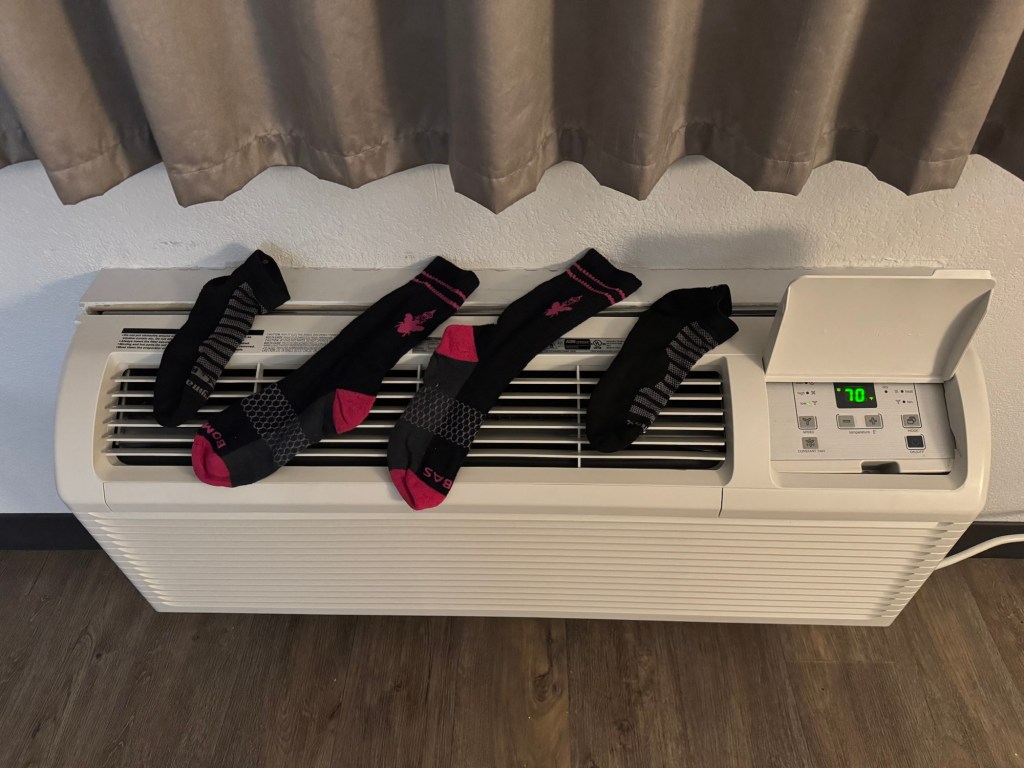 I took a pair of Bombas socks instead of my red cat socks. The Bombas socks are more comfortable, durable, and dry faster. Next time, I would bring longer dry-fit athletic socks instead because they dry even faster. I am still wearing small, ankle socks underneath the Bombas on travel days.