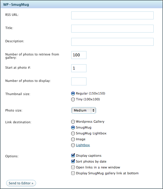 Finally, click on the Send to Editor button to insert the WP-SmugMug shortcode into your post. You may place the shortcode wherever you want the gallery thumbnails to appear.